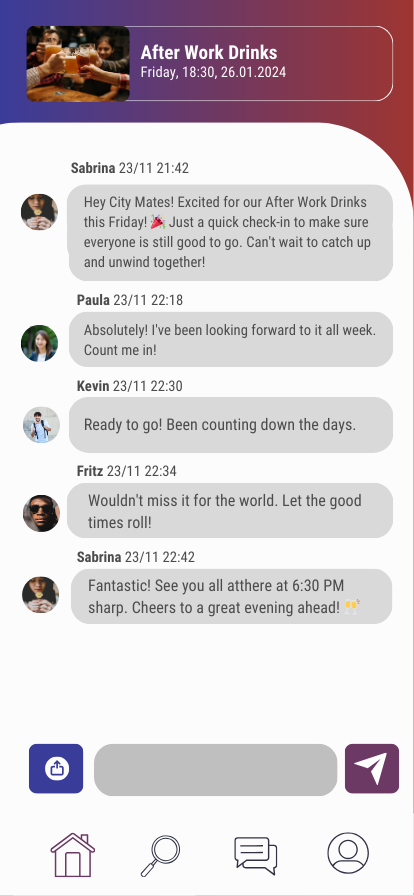 Use the built-in chat feature to sort out details, ask questions, and connect with your future City Mates before meeting.